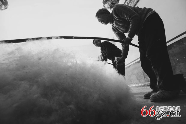 贵州省威宁县兔街乡新升村是一个有着595户人家集汉族、苗族、彝族杂居的偏远山村,距县城75公里。从古自今该村仍保留着古老的民间擀毡工艺。据该村76岁的毡匠李兴文介绍,擀毡工艺2000多年前在威宁县就有了,在明清时期比较兴旺发达,威宁的凉山和半凉山都有擀毡工艺。主要传承在雪山、龙街、大街、兔街、云贵、石门、黑土河等乡镇。随着社会的进步,人们物质生活水平的不断提高,由于擀毡制品工艺费时费力,经济效益低,擀毡工匠越来越少。现仅存的云贵乡、兔街乡新升村尚有10余户人家虽然还在从事着古老擀毡工艺,但绝大部分人家由于后继无人而无法再成批量的进行擀毡制作。